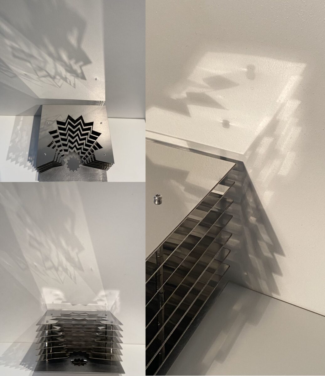 The Spring of the Sun, explores the interplay between geometry, reflection, and perception through a meticulously constructed layered sculpture made of mirror-polished stainless steel. Inspired by patterns found in both nature and traditional Iranian architecture, the piece deconstructs symmetry and order, inviting the viewer into a shifting spatial experience.
